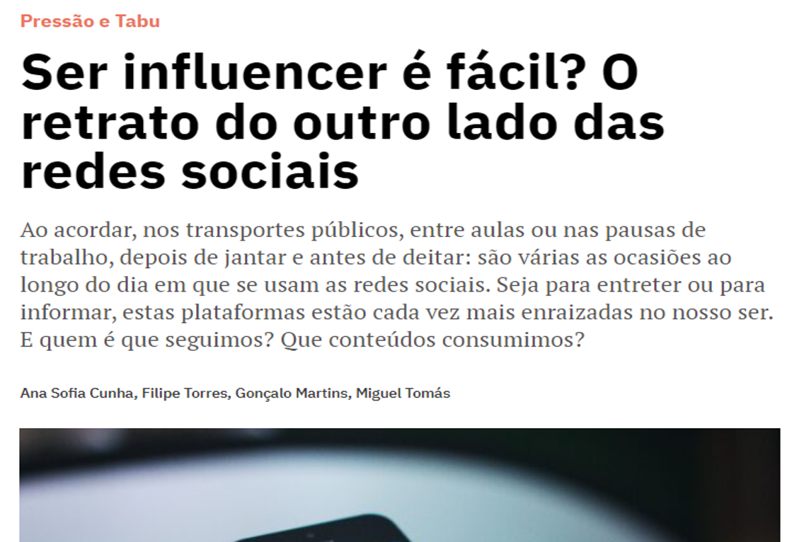 "Ser influencer é fácil? O retrato do outro lado das redes sociais" é uma grande reportagem que explica como funciona o mundo dos influencers digitais. Realizada, em conjunto com outros colegas de turma, no âmbito da unidade curricular "Narrativas e Guião para Jornalismo" (de outubro de 2020 a janeiro de 2021).